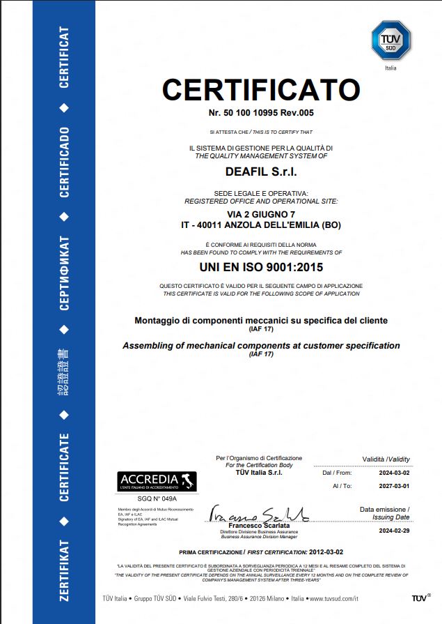 Deafil srl Via 2 giugno n.7 C.A.P. 40011 Anzola dell’ Emilia Bologna Italia info@deafil.com
